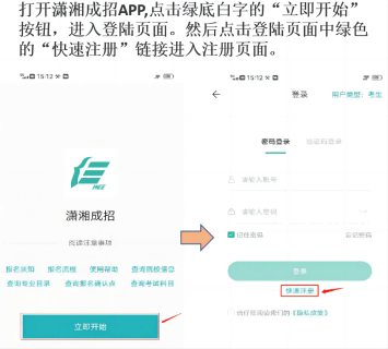退役军人报考2024年常德成人高考,打开潇湘成招APP,点击绿底白字的“立即开始”按钮,进入登陆页面。然后点击登陆页面中绿色的“快速注册”链接进入注册页面,然后根据注册系统页面提示如实填写相关个人信息即可。