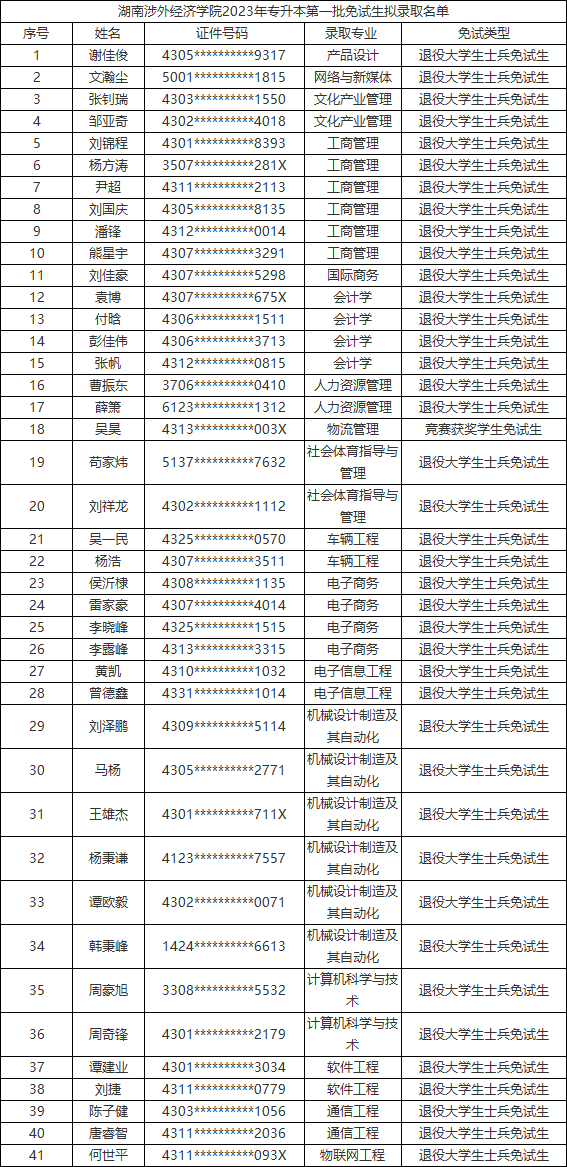 2023年湖南涉外经济学院专升本第一批免试生拟录取名单!根据湖南省教育厅《关于印发2023年湖南省普通高等学校专升本考试招生工作实施方案的通知》(湘教发〔2022〕55号)、《湖南涉外经济学院2023年专升本招生章程》和《湖南涉外经济学院2023年专升本免试生综合能力测试工作的通知》等文件精神,我校第一批免试生分竞赛获奖免试生和退役大学生士兵免试生两类进行录取,拟录取41人。
