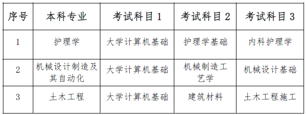 从以上内容同学们可以知道该院校2023年专升本招生专业分别有护理学,机械设计制造及其自动化以及土木工程。各专业的专升本考试科目同学们可以对照表格查看,每个专业的专升本考试科目有一门公共课,两门专业课,其中每个专业的公共课考试都是大学计算机基础。同学们可以根据考试科目有针对性的复习哦。