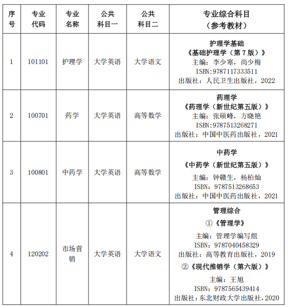 2025年湖南中医药大学湘杏学院专升本考试大纲已公示,2025年湖南中医药大学湘杏学院共有4个专业招生,具体参考教材如下:
