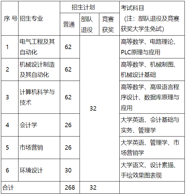 湖南工程学院应用技术学院2022年计划招收专升本学生共计300人,其中普通招生计划268人、退役大学生士兵及竞赛获奖学生免试计划32人。招生专业、招生计划及考试科目如下: